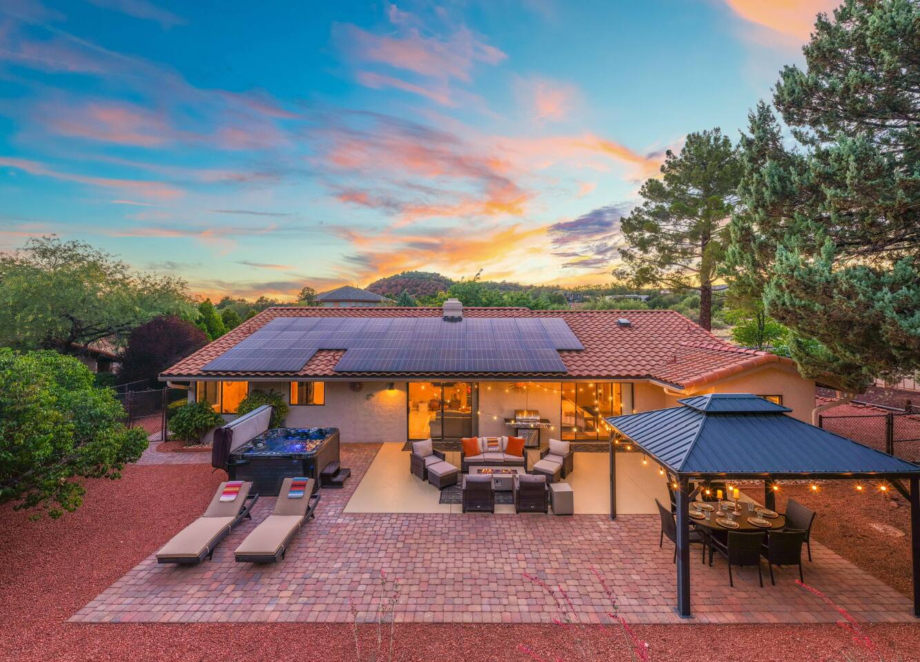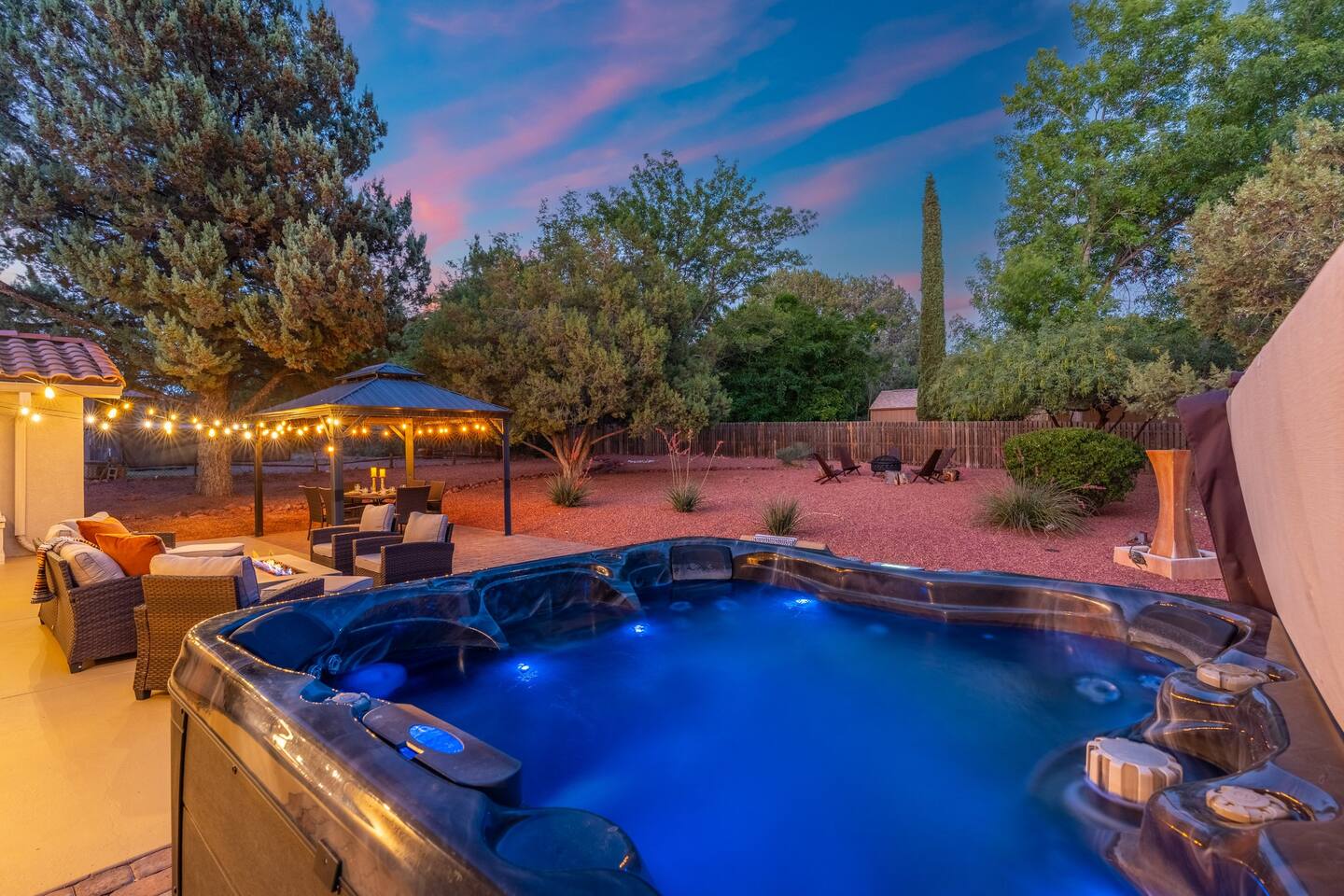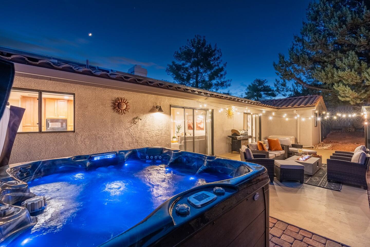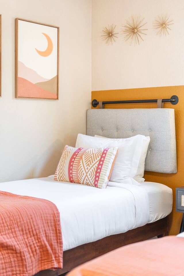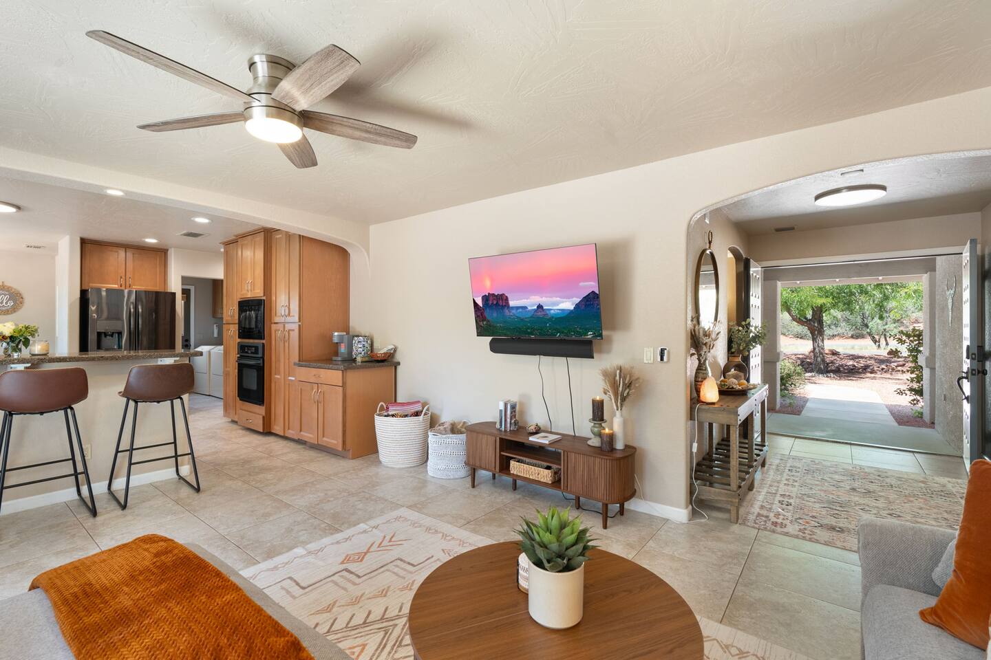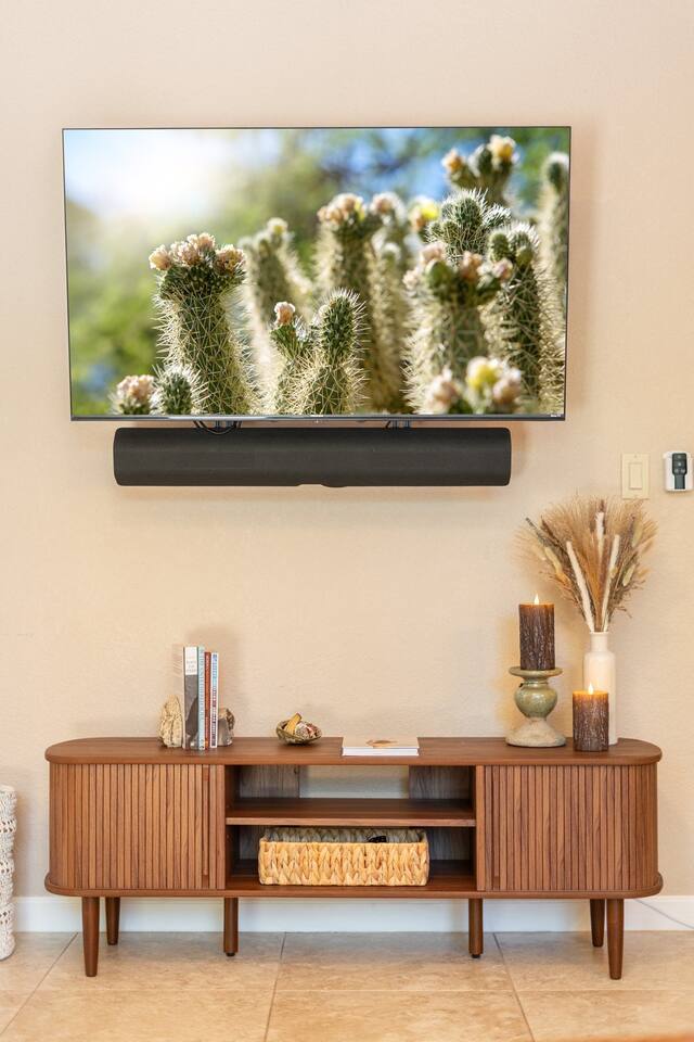 KEY FEATURES 🌄 Red Rock Views: Cathedral Rock and Mammoth Rock visible from the property 🚶 Walk to Trailheads: Easy neighborhood access to Chapel Trail, Mystic Trail, and Little Horse 📍 Prime Location: In Sedona’s coveted Chapel neighborhood, minutes to Uptown, West Sedona, and the Village of Oak Creek 🛁 Hot Tub and Two Fire Pits: Perfect for post-hike soaks and sunset nights 🏡 Spacious 4BR/2.5BA: Nearly 2,000 sq ft, comfortably sleeps up to 9 🛜 High-Speed Fiber Internet (300 Mbps): Great for streaming, video calls, or remote work 👶 Family-friendly: High chair and Pack ’n Play available 🧺 Washer and dryer: Easy resets for longer stays 🐾 Dog-friendly: Up to 2 well-behaved dogs welcome (fee applies) 🌞 Solar Powered: Energy-efficient and eco-minded WHAT GUESTS ARE SAYING “10/10 house. The best house I ever booked from Airbnb.” — Jenny “An exceptional retreat that truly feels like home.” — Freddie “The house and yard were roomy, and the neighborhood peaceful and very scenic.” — Caroline “The location is unbeatable... just minutes from the best trailheads and restaurants!” — Tim "I wish we didn't have to leave." — Brook “We would be thrilled to stay here again on my next trip to Sedona.” — Edith INSIDE Vista Bonita is comfortable, thoughtfully arranged, and designed for unwinding between red rock adventures. You’ll have great views, two living areas, and the kind of flow that works for families, couples, and friend groups alike. KITCHEN & LIVING AREAS The home features two separate living spaces, so your group can gather together or spread out. • Main living room: Large comfy sectional, smart TV, soundbar • Second living area: Ideal for reading, games, or a quiet movie night • Kitchen: Fully stocked cookware and utensils, bar seating, Keurig and drip coffee makers • Breakfast nook: A sunny spot for morning coffee • Dining table: Great for group dinners 4 BEDROOMS Each bedroom has its own vibe and is well equipped. • Primary Suite: King bed, ensuite bathroom, and direct patio access. Spacious and serene, perfect for relaxing after a day of adventure. • Desert Dusk Suite: Queen bed + twin bed. Cozy with sunset tones. Ideal for mix groups or kids. • Modern Ranch Suite: King bed. Modern Western style. • Canyon Bloom Suite: King bed. Floral touches and soft lighting for a dreamy stay. Each bedroom includes luggage racks, closet storage, smart TV, and extra pillows/blankets. 2.5 BATHROOMS Fresh towels, hair dryer, and essential toiletries are provided. • Primary en-suite: Dual sinks, shower, and large closet. • Guest bathroom: Sinks and shower/bath combo. • Half bath: Conveniently located near the kitchen/living area. OUTDOOR EXPERIENCE Set on over ⅓ of an acre, Vista Bonita’s yard is made for gathering, stargazing, and slowing down. • Hot tub for starlit soaks • Two fire pits: Propane fire pit with cushioned seating, plus a wood fire pit (subject to local fire restrictions) • Outdoor dining for al fresco dinners • Water feature for a calm, desert soundtrack • Loungers for sun, shade, and night skies LOCATION Nestled in the quiet Chapel neighborhood, you’re ideally positioned between Uptown, West Sedona, and the Village of Oak Creek. You're close to restaurants and shops and also walking distance to iconic trailheads. • Walkable access to Chapel Trail, Mystic Trail, and Little Horse • <6 min drive to Bell Rock, Cathedral Rock Trailhead • 8 min drive: Tlaquepaque Arts & Shopping Village DOGS WELCOME Up to 2 well-behaved dogs are welcome for an additional fee. Please clean up after them, keep them off furniture, and do not leave them unattended. We provide a fenced area plus food and water bowls. FINAL NOTES • Smart lock for easy self-check-in • Washer/dryer included • Driveway parking for 2 cars, with room for 1 more car on the gravel (3 cars total)