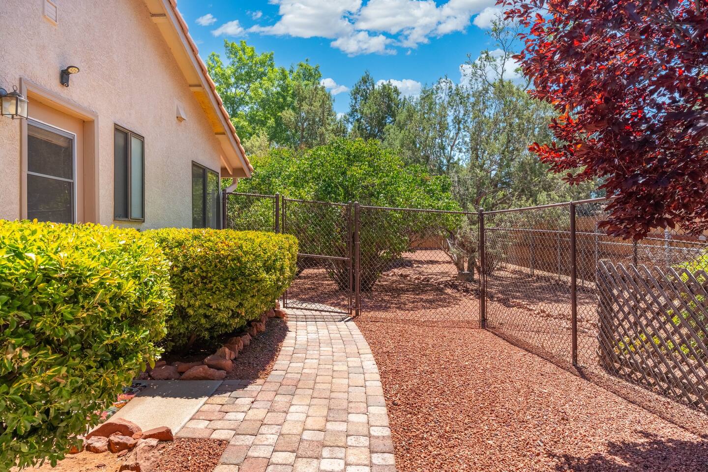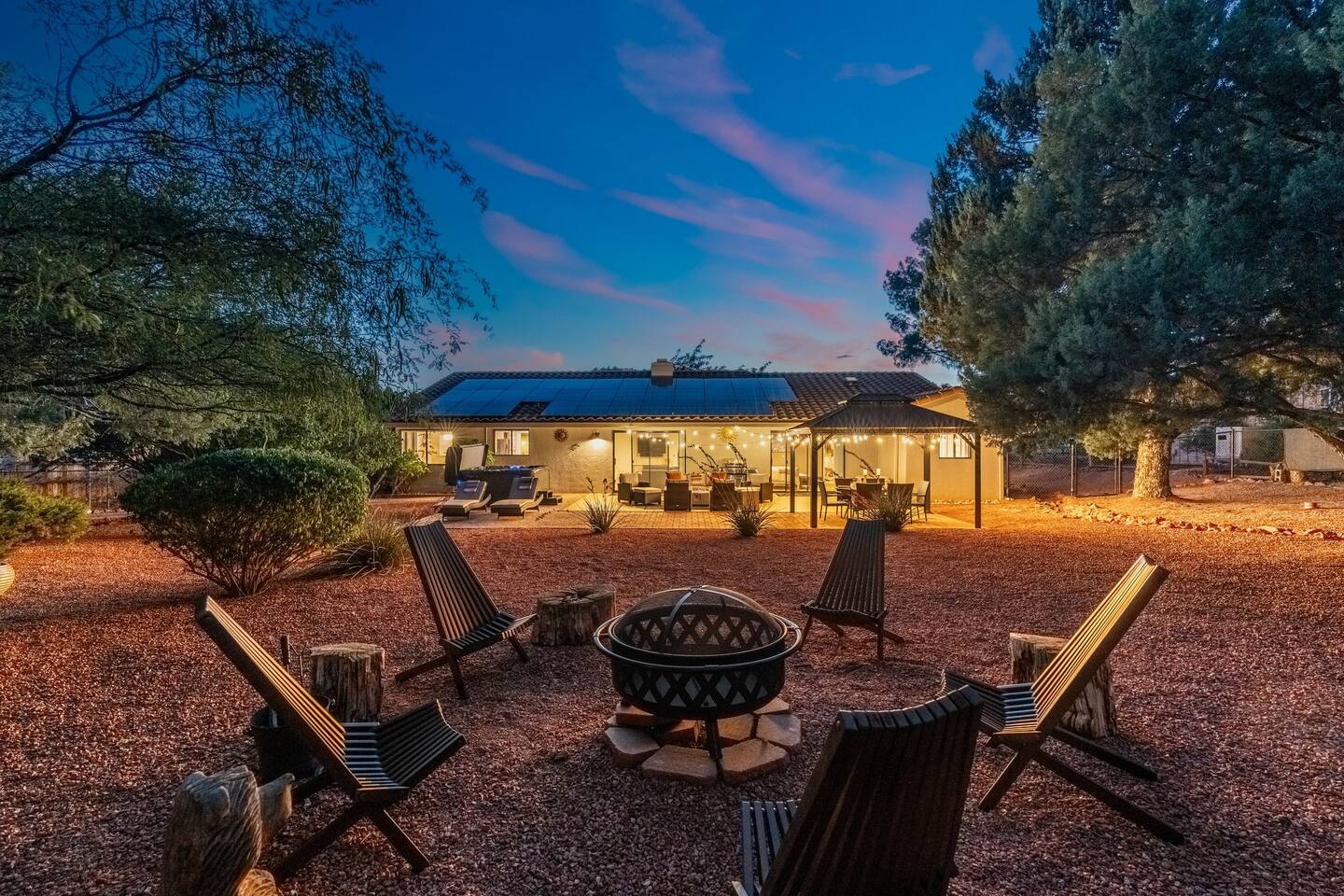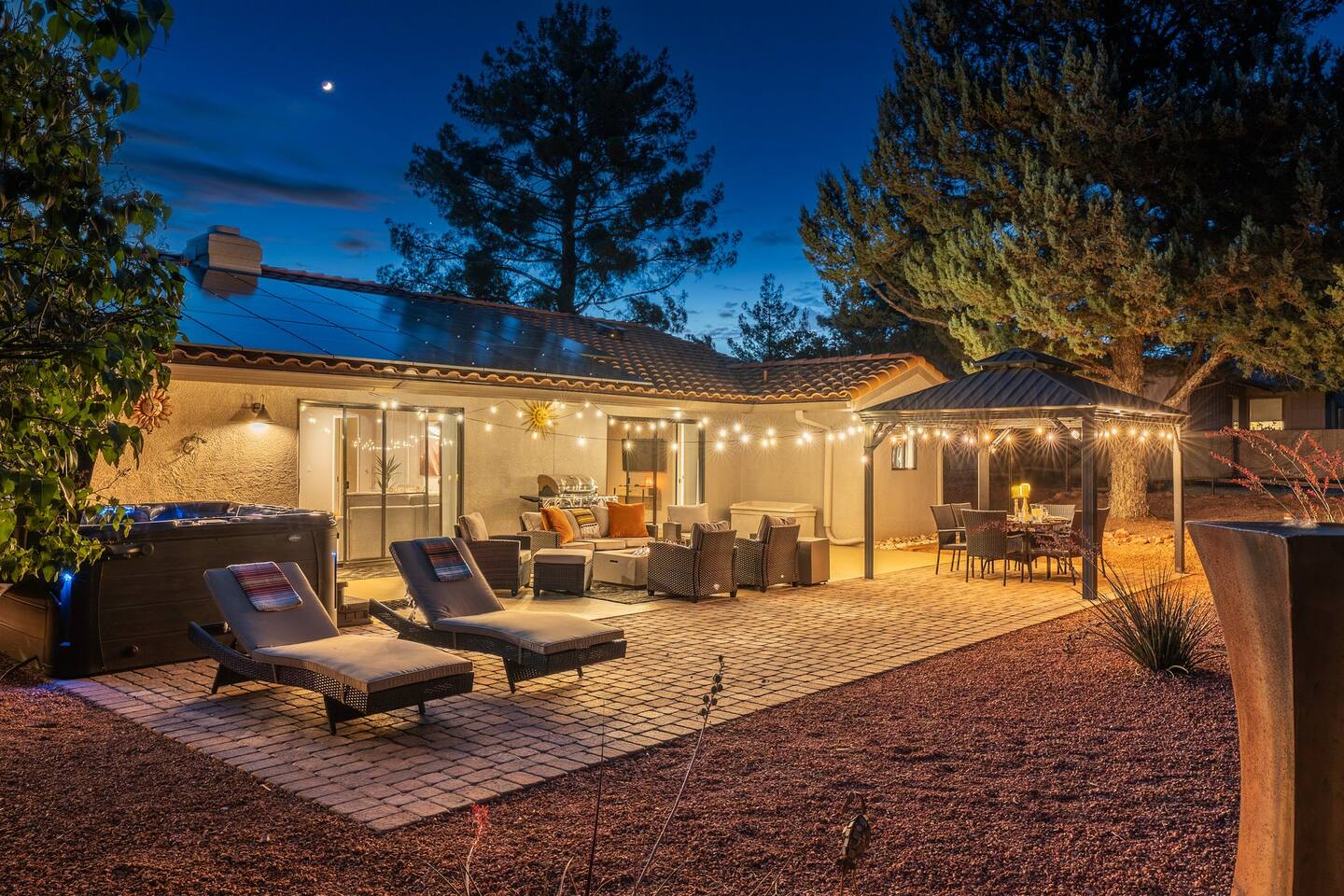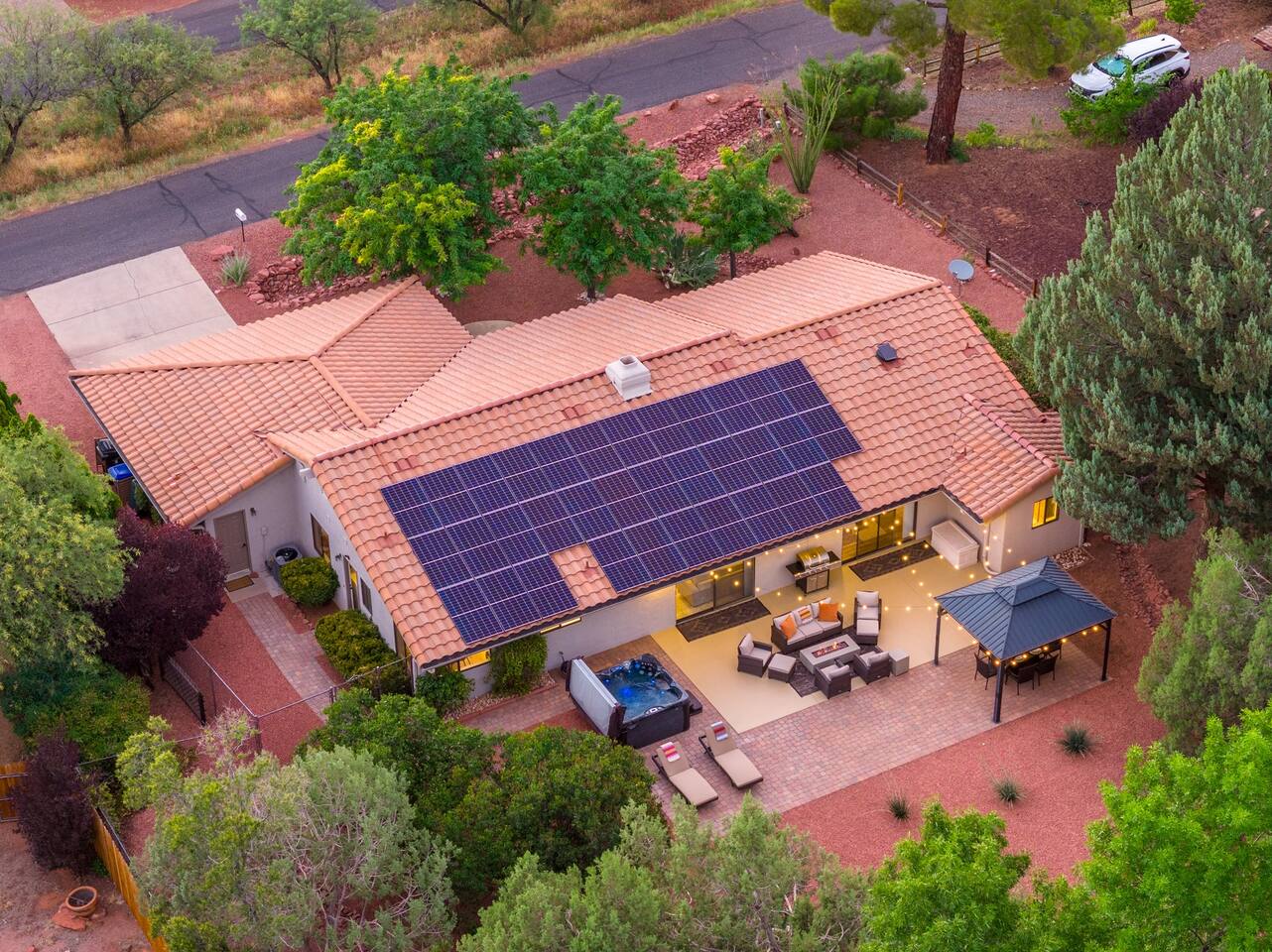 KEY FEATURES 🌄 Red Rock Views: Cathedral Rock and Mammoth Rock visible from the property 🚶 Walk to Trailheads: Easy neighborhood access to Chapel Trail, Mystic Trail, and Little Horse 📍 Prime Location: In Sedona’s coveted Chapel neighborhood, minutes to Uptown, West Sedona, and the Village of Oak Creek 🛁 Hot Tub and Two Fire Pits: Perfect for post-hike soaks and sunset nights 🏡 Spacious 4BR/2.5BA: Nearly 2,000 sq ft, comfortably sleeps up to 9 🛜 High-Speed Fiber Internet (300 Mbps): Great for streaming, video calls, or remote work 👶 Family-friendly: High chair and Pack ’n Play available 🧺 Washer and dryer: Easy resets for longer stays 🐾 Dog-friendly: Up to 2 well-behaved dogs welcome (fee applies) 🌞 Solar Powered: Energy-efficient and eco-minded WHAT GUESTS ARE SAYING “10/10 house. The best house I ever booked from Airbnb.” — Jenny “An exceptional retreat that truly feels like home.” — Freddie “The house and yard were roomy, and the neighborhood peaceful and very scenic.” — Caroline “The location is unbeatable... just minutes from the best trailheads and restaurants!” — Tim "I wish we didn't have to leave." — Brook “We would be thrilled to stay here again on my next trip to Sedona.” — Edith INSIDE Vista Bonita is comfortable, thoughtfully arranged, and designed for unwinding between red rock adventures. You’ll have great views, two living areas, and the kind of flow that works for families, couples, and friend groups alike. KITCHEN & LIVING AREAS The home features two separate living spaces, so your group can gather together or spread out. • Main living room: Large comfy sectional, smart TV, soundbar • Second living area: Ideal for reading, games, or a quiet movie night • Kitchen: Fully stocked cookware and utensils, bar seating, Keurig and drip coffee makers • Breakfast nook: A sunny spot for morning coffee • Dining table: Great for group dinners 4 BEDROOMS Each bedroom has its own vibe and is well equipped. • Primary Suite: King bed, ensuite bathroom, and direct patio access. Spacious and serene, perfect for relaxing after a day of adventure. • Desert Dusk Suite: Queen bed + twin bed. Cozy with sunset tones. Ideal for mix groups or kids. • Modern Ranch Suite: King bed. Modern Western style. • Canyon Bloom Suite: King bed. Floral touches and soft lighting for a dreamy stay. Each bedroom includes luggage racks, closet storage, smart TV, and extra pillows/blankets. 2.5 BATHROOMS Fresh towels, hair dryer, and essential toiletries are provided. • Primary en-suite: Dual sinks, shower, and large closet. • Guest bathroom: Sinks and shower/bath combo. • Half bath: Conveniently located near the kitchen/living area. OUTDOOR EXPERIENCE Set on over ⅓ of an acre, Vista Bonita’s yard is made for gathering, stargazing, and slowing down. • Hot tub for starlit soaks • Two fire pits: Propane fire pit with cushioned seating, plus a wood fire pit (subject to local fire restrictions) • Outdoor dining for al fresco dinners • Water feature for a calm, desert soundtrack • Loungers for sun, shade, and night skies LOCATION Nestled in the quiet Chapel neighborhood, you’re ideally positioned between Uptown, West Sedona, and the Village of Oak Creek. You're close to restaurants and shops and also walking distance to iconic trailheads. • Walkable access to Chapel Trail, Mystic Trail, and Little Horse • <6 min drive to Bell Rock, Cathedral Rock Trailhead • 8 min drive: Tlaquepaque Arts & Shopping Village DOGS WELCOME Up to 2 well-behaved dogs are welcome for an additional fee. Please clean up after them, keep them off furniture, and do not leave them unattended. We provide a fenced area plus food and water bowls. FINAL NOTES • Smart lock for easy self-check-in • Washer/dryer included • Driveway parking for 2 cars, with room for 1 more car on the gravel (3 cars total)