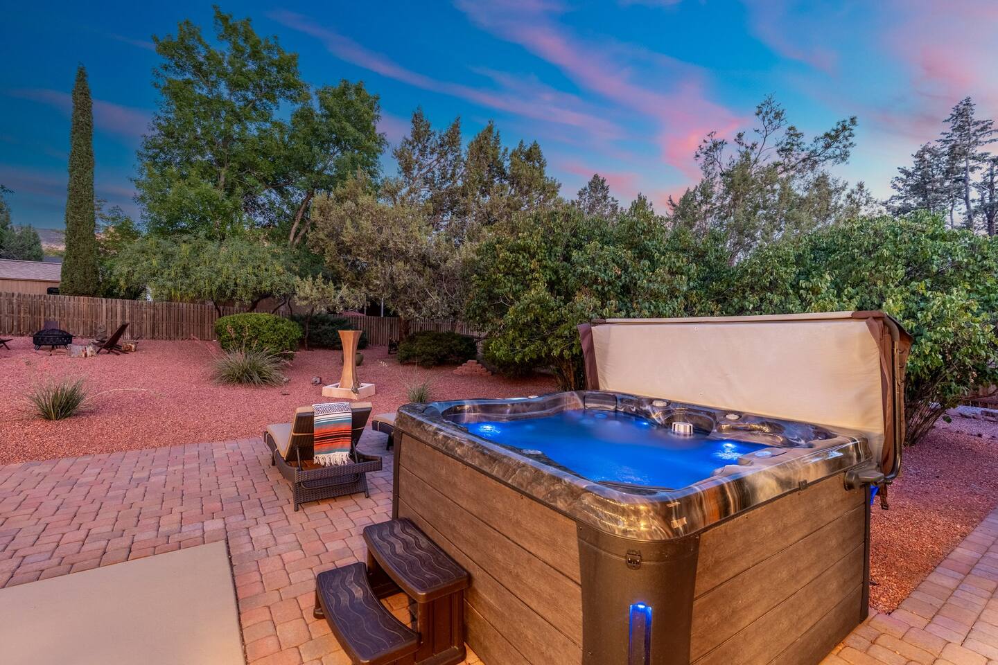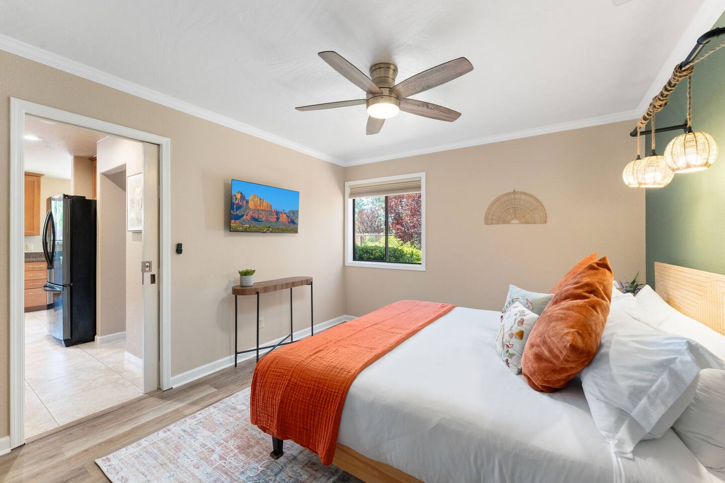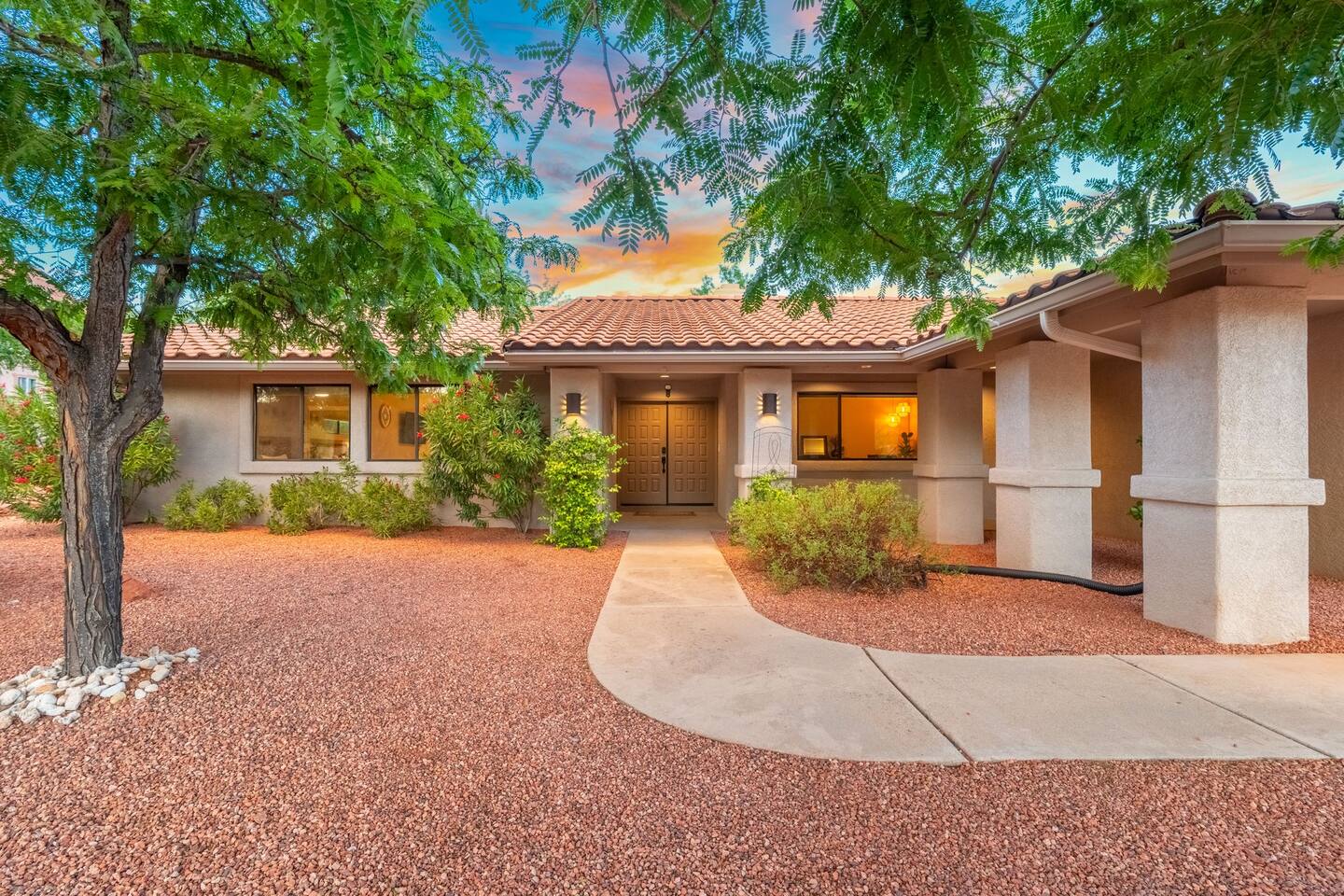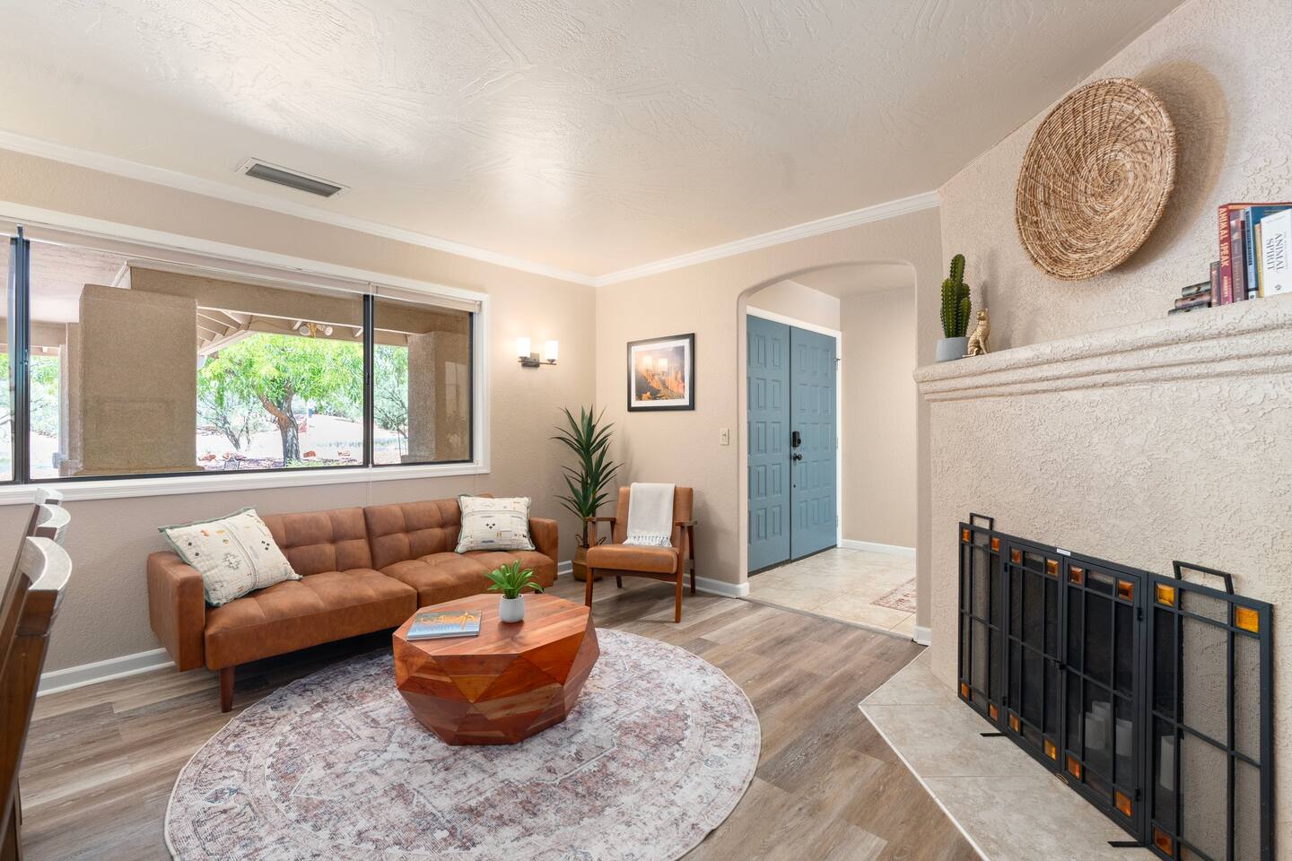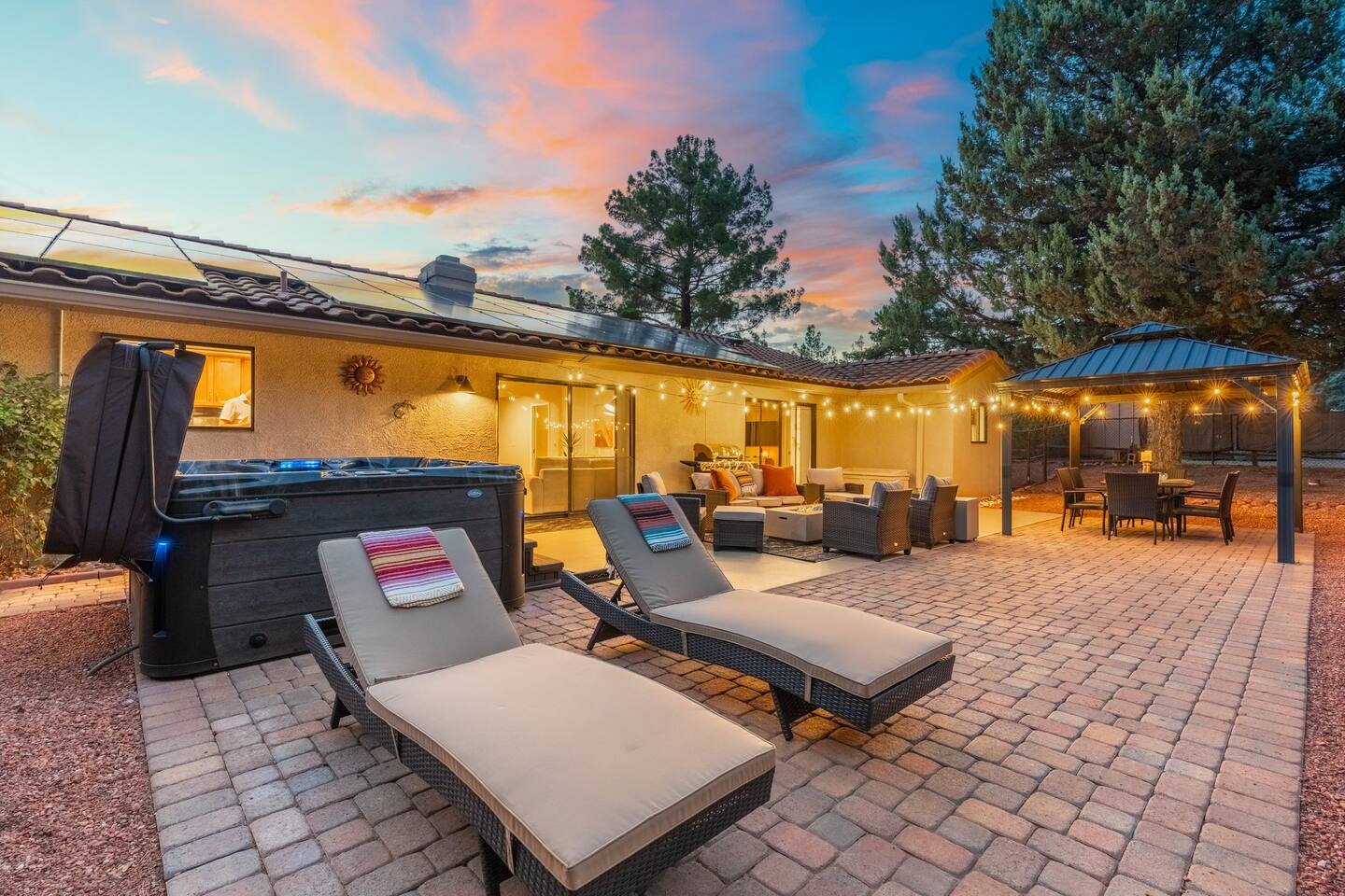 KEY FEATURES 🌄 Red Rock Views: Cathedral Rock and Mammoth Rock visible from the property 🚶 Walk to Trailheads: Easy neighborhood access to Chapel Trail, Mystic Trail, and Little Horse 📍 Prime Location: In Sedona’s coveted Chapel neighborhood, minutes to Uptown, West Sedona, and the Village of Oak Creek 🛁 Hot Tub and Two Fire Pits: Perfect for post-hike soaks and sunset nights 🏡 Spacious 4BR/2.5BA: Nearly 2,000 sq ft, comfortably sleeps up to 9 🛜 High-Speed Fiber Internet (300 Mbps): Great for streaming, video calls, or remote work 👶 Family-friendly: High chair and Pack ’n Play available 🧺 Washer and dryer: Easy resets for longer stays 🐾 Dog-friendly: Up to 2 well-behaved dogs welcome (fee applies) 🌞 Solar Powered: Energy-efficient and eco-minded WHAT GUESTS ARE SAYING “10/10 house. The best house I ever booked from Airbnb.” — Jenny “An exceptional retreat that truly feels like home.” — Freddie “The house and yard were roomy, and the neighborhood peaceful and very scenic.” — Caroline “The location is unbeatable... just minutes from the best trailheads and restaurants!” — Tim "I wish we didn't have to leave." — Brook “We would be thrilled to stay here again on my next trip to Sedona.” — Edith INSIDE Vista Bonita is comfortable, thoughtfully arranged, and designed for unwinding between red rock adventures. You’ll have great views, two living areas, and the kind of flow that works for families, couples, and friend groups alike. KITCHEN & LIVING AREAS The home features two separate living spaces, so your group can gather together or spread out. • Main living room: Large comfy sectional, smart TV, soundbar • Second living area: Ideal for reading, games, or a quiet movie night • Kitchen: Fully stocked cookware and utensils, bar seating, Keurig and drip coffee makers • Breakfast nook: A sunny spot for morning coffee • Dining table: Great for group dinners 4 BEDROOMS Each bedroom has its own vibe and is well equipped. • Primary Suite: King bed, ensuite bathroom, and direct patio access. Spacious and serene, perfect for relaxing after a day of adventure. • Desert Dusk Suite: Queen bed + twin bed. Cozy with sunset tones. Ideal for mix groups or kids. • Modern Ranch Suite: King bed. Modern Western style. • Canyon Bloom Suite: King bed. Floral touches and soft lighting for a dreamy stay. Each bedroom includes luggage racks, closet storage, smart TV, and extra pillows/blankets. 2.5 BATHROOMS Fresh towels, hair dryer, and essential toiletries are provided. • Primary en-suite: Dual sinks, shower, and large closet. • Guest bathroom: Sinks and shower/bath combo. • Half bath: Conveniently located near the kitchen/living area. OUTDOOR EXPERIENCE Set on over ⅓ of an acre, Vista Bonita’s yard is made for gathering, stargazing, and slowing down. • Hot tub for starlit soaks • Two fire pits: Propane fire pit with cushioned seating, plus a wood fire pit (subject to local fire restrictions) • Outdoor dining for al fresco dinners • Water feature for a calm, desert soundtrack • Loungers for sun, shade, and night skies LOCATION Nestled in the quiet Chapel neighborhood, you’re ideally positioned between Uptown, West Sedona, and the Village of Oak Creek. You're close to restaurants and shops and also walking distance to iconic trailheads. • Walkable access to Chapel Trail, Mystic Trail, and Little Horse • <6 min drive to Bell Rock, Cathedral Rock Trailhead • 8 min drive: Tlaquepaque Arts & Shopping Village DOGS WELCOME Up to 2 well-behaved dogs are welcome for an additional fee. Please clean up after them, keep them off furniture, and do not leave them unattended. We provide a fenced area plus food and water bowls. FINAL NOTES • Smart lock for easy self-check-in • Washer/dryer included • Driveway parking for 2 cars, with room for 1 more car on the gravel (3 cars total)