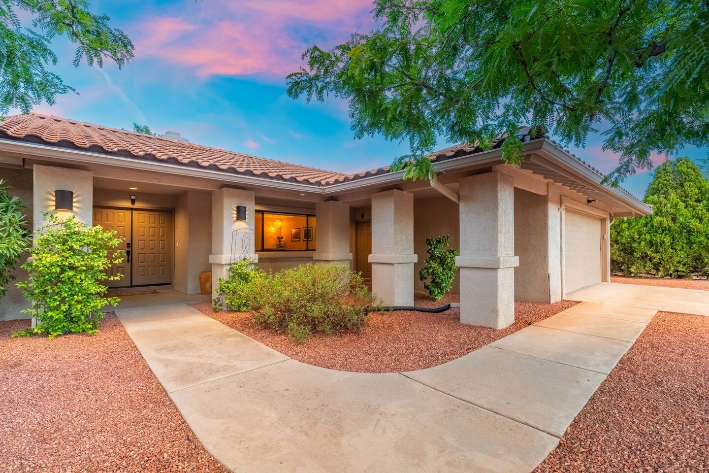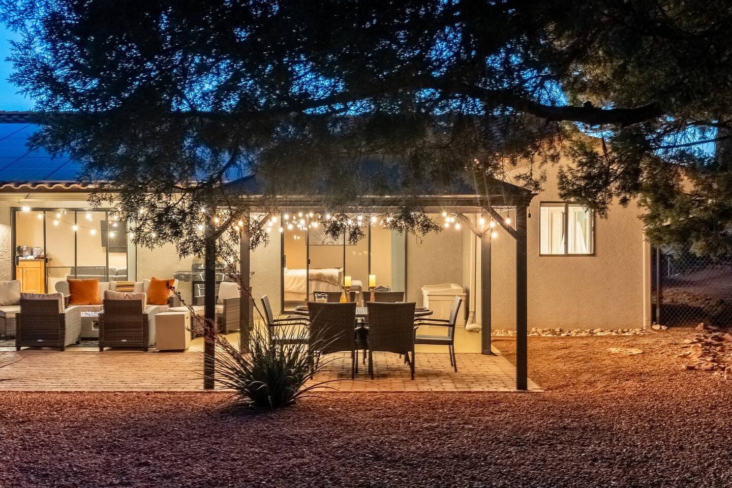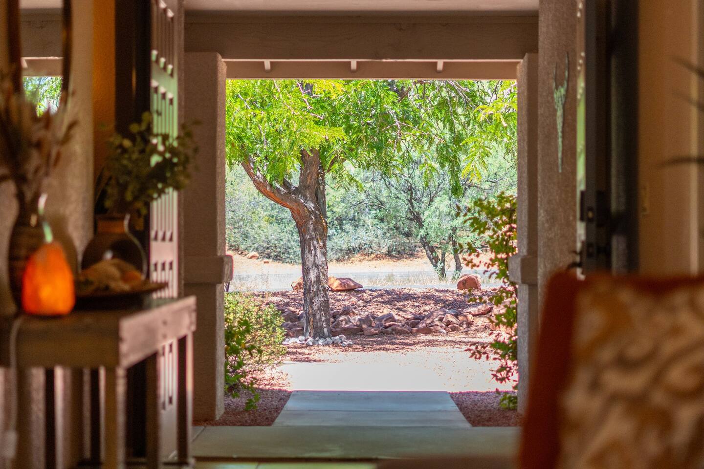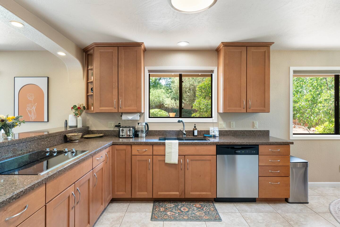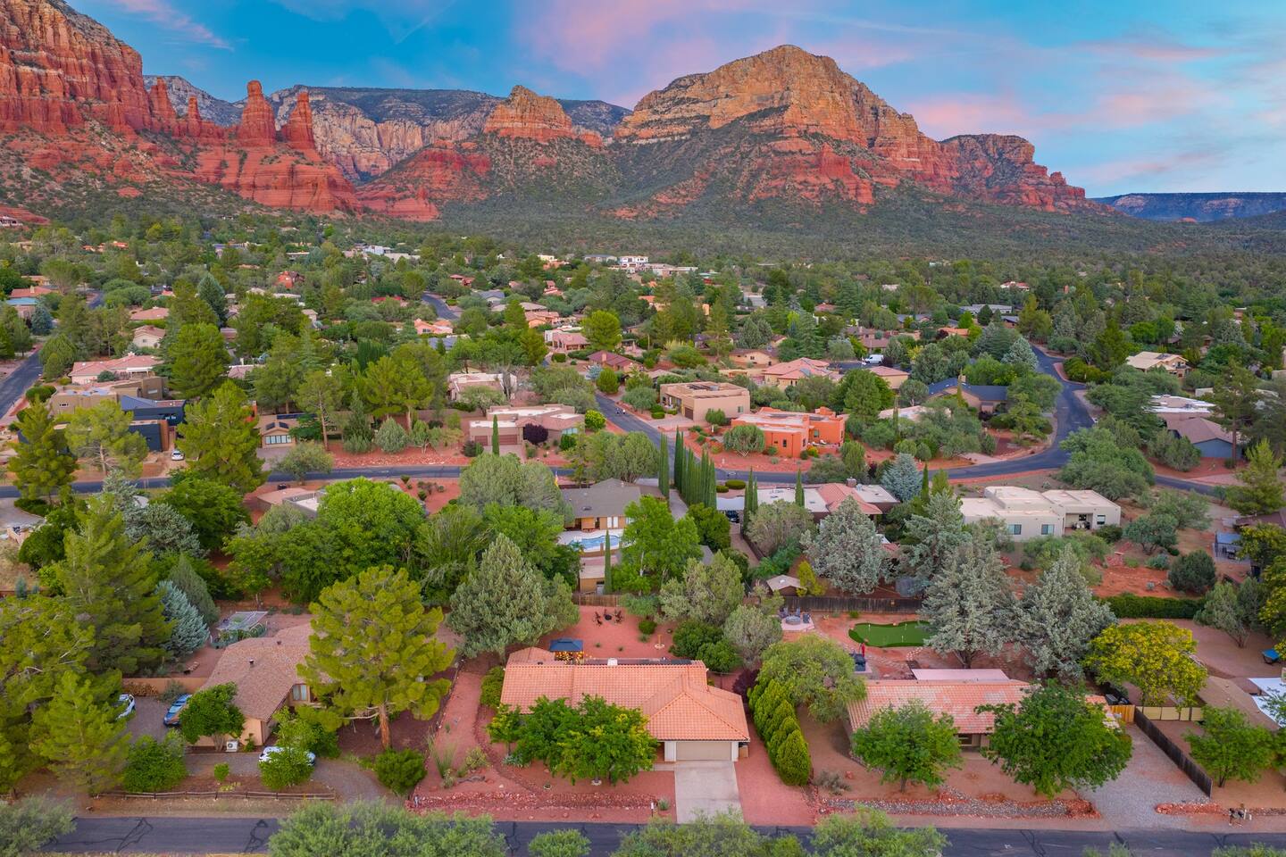 KEY FEATURES 🌄 Red Rock Views: Cathedral Rock and Mammoth Rock visible from the property 🚶 Walk to Trailheads: Easy neighborhood access to Chapel Trail, Mystic Trail, and Little Horse 📍 Prime Location: In Sedona’s coveted Chapel neighborhood, minutes to Uptown, West Sedona, and the Village of Oak Creek 🛁 Hot Tub and Two Fire Pits: Perfect for post-hike soaks and sunset nights 🏡 Spacious 4BR/2.5BA: Nearly 2,000 sq ft, comfortably sleeps up to 9 🛜 High-Speed Fiber Internet (300 Mbps): Great for streaming, video calls, or remote work 👶 Family-friendly: High chair and Pack ’n Play available 🧺 Washer and dryer: Easy resets for longer stays 🐾 Dog-friendly: Up to 2 well-behaved dogs welcome (fee applies) 🌞 Solar Powered: Energy-efficient and eco-minded WHAT GUESTS ARE SAYING “10/10 house. The best house I ever booked from Airbnb.” — Jenny “An exceptional retreat that truly feels like home.” — Freddie “The house and yard were roomy, and the neighborhood peaceful and very scenic.” — Caroline “The location is unbeatable... just minutes from the best trailheads and restaurants!” — Tim "I wish we didn't have to leave." — Brook “We would be thrilled to stay here again on my next trip to Sedona.” — Edith INSIDE Vista Bonita is comfortable, thoughtfully arranged, and designed for unwinding between red rock adventures. You’ll have great views, two living areas, and the kind of flow that works for families, couples, and friend groups alike. KITCHEN & LIVING AREAS The home features two separate living spaces, so your group can gather together or spread out. • Main living room: Large comfy sectional, smart TV, soundbar • Second living area: Ideal for reading, games, or a quiet movie night • Kitchen: Fully stocked cookware and utensils, bar seating, Keurig and drip coffee makers • Breakfast nook: A sunny spot for morning coffee • Dining table: Great for group dinners 4 BEDROOMS Each bedroom has its own vibe and is well equipped. • Primary Suite: King bed, ensuite bathroom, and direct patio access. Spacious and serene, perfect for relaxing after a day of adventure. • Desert Dusk Suite: Queen bed + twin bed. Cozy with sunset tones. Ideal for mix groups or kids. • Modern Ranch Suite: King bed. Modern Western style. • Canyon Bloom Suite: King bed. Floral touches and soft lighting for a dreamy stay. Each bedroom includes luggage racks, closet storage, smart TV, and extra pillows/blankets. 2.5 BATHROOMS Fresh towels, hair dryer, and essential toiletries are provided. • Primary en-suite: Dual sinks, shower, and large closet. • Guest bathroom: Sinks and shower/bath combo. • Half bath: Conveniently located near the kitchen/living area. OUTDOOR EXPERIENCE Set on over ⅓ of an acre, Vista Bonita’s yard is made for gathering, stargazing, and slowing down. • Hot tub for starlit soaks • Two fire pits: Propane fire pit with cushioned seating, plus a wood fire pit (subject to local fire restrictions) • Outdoor dining for al fresco dinners • Water feature for a calm, desert soundtrack • Loungers for sun, shade, and night skies LOCATION Nestled in the quiet Chapel neighborhood, you’re ideally positioned between Uptown, West Sedona, and the Village of Oak Creek. You're close to restaurants and shops and also walking distance to iconic trailheads. • Walkable access to Chapel Trail, Mystic Trail, and Little Horse • <6 min drive to Bell Rock, Cathedral Rock Trailhead • 8 min drive: Tlaquepaque Arts & Shopping Village DOGS WELCOME Up to 2 well-behaved dogs are welcome for an additional fee. Please clean up after them, keep them off furniture, and do not leave them unattended. We provide a fenced area plus food and water bowls. FINAL NOTES • Smart lock for easy self-check-in • Washer/dryer included • Driveway parking for 2 cars, with room for 1 more car on the gravel (3 cars total)