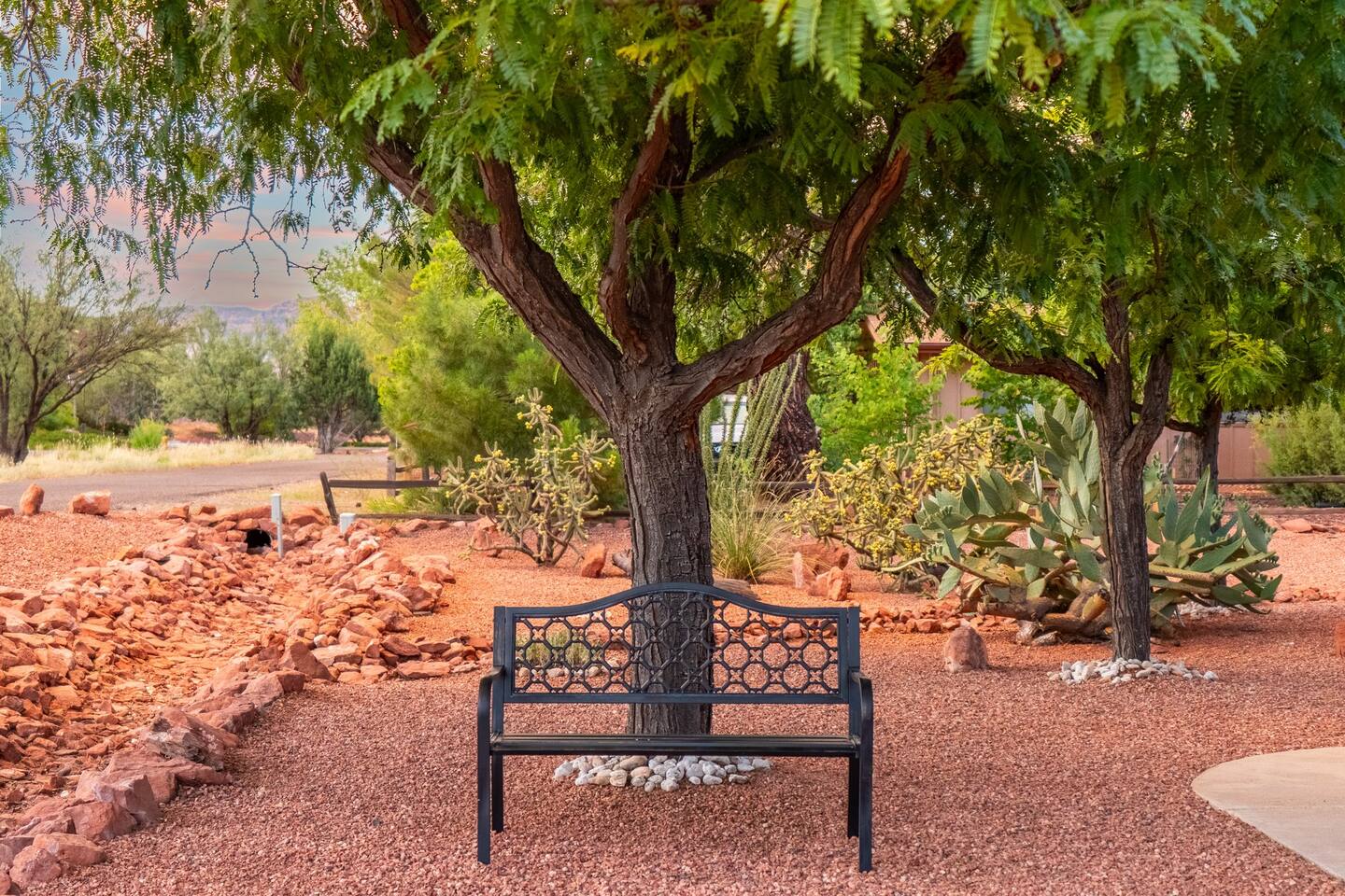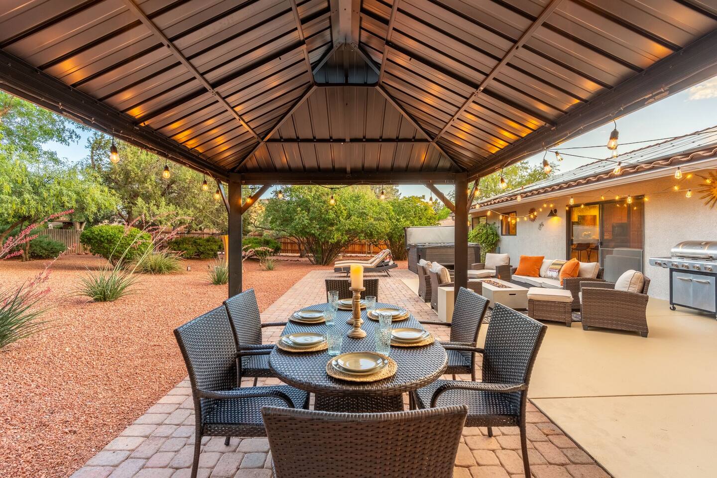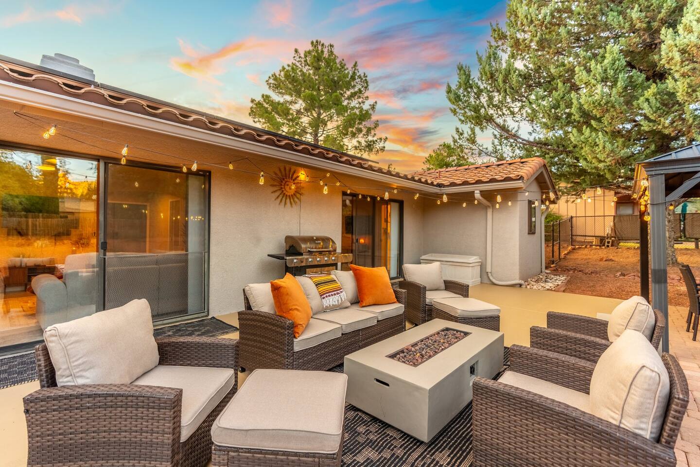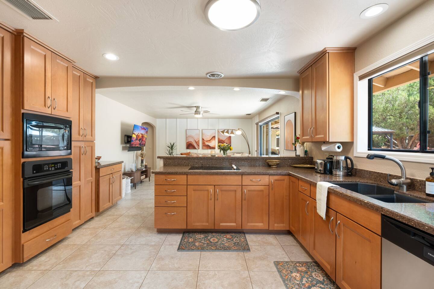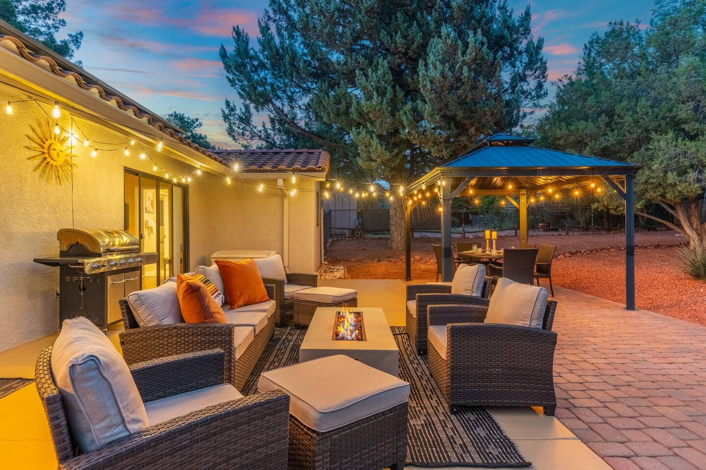 KEY FEATURES 🌄 Red Rock Views: Cathedral Rock and Mammoth Rock visible from the property 🚶 Walk to Trailheads: Easy neighborhood access to Chapel Trail, Mystic Trail, and Little Horse 📍 Prime Location: In Sedona’s coveted Chapel neighborhood, minutes to Uptown, West Sedona, and the Village of Oak Creek 🛁 Hot Tub and Two Fire Pits: Perfect for post-hike soaks and sunset nights 🏡 Spacious 4BR/2.5BA: Nearly 2,000 sq ft, comfortably sleeps up to 9 🛜 High-Speed Fiber Internet (300 Mbps): Great for streaming, video calls, or remote work 👶 Family-friendly: High chair and Pack ’n Play available 🧺 Washer and dryer: Easy resets for longer stays 🐾 Dog-friendly: Up to 2 well-behaved dogs welcome (fee applies) 🌞 Solar Powered: Energy-efficient and eco-minded WHAT GUESTS ARE SAYING “10/10 house. The best house I ever booked from Airbnb.” — Jenny “An exceptional retreat that truly feels like home.” — Freddie “The house and yard were roomy, and the neighborhood peaceful and very scenic.” — Caroline “The location is unbeatable... just minutes from the best trailheads and restaurants!” — Tim "I wish we didn't have to leave." — Brook “We would be thrilled to stay here again on my next trip to Sedona.” — Edith INSIDE Vista Bonita is comfortable, thoughtfully arranged, and designed for unwinding between red rock adventures. You’ll have great views, two living areas, and the kind of flow that works for families, couples, and friend groups alike. KITCHEN & LIVING AREAS The home features two separate living spaces, so your group can gather together or spread out. • Main living room: Large comfy sectional, smart TV, soundbar • Second living area: Ideal for reading, games, or a quiet movie night • Kitchen: Fully stocked cookware and utensils, bar seating, Keurig and drip coffee makers • Breakfast nook: A sunny spot for morning coffee • Dining table: Great for group dinners 4 BEDROOMS Each bedroom has its own vibe and is well equipped. • Primary Suite: King bed, ensuite bathroom, and direct patio access. Spacious and serene, perfect for relaxing after a day of adventure. • Desert Dusk Suite: Queen bed + twin bed. Cozy with sunset tones. Ideal for mix groups or kids. • Modern Ranch Suite: King bed. Modern Western style. • Canyon Bloom Suite: King bed. Floral touches and soft lighting for a dreamy stay. Each bedroom includes luggage racks, closet storage, smart TV, and extra pillows/blankets. 2.5 BATHROOMS Fresh towels, hair dryer, and essential toiletries are provided. • Primary en-suite: Dual sinks, shower, and large closet. • Guest bathroom: Sinks and shower/bath combo. • Half bath: Conveniently located near the kitchen/living area. OUTDOOR EXPERIENCE Set on over ⅓ of an acre, Vista Bonita’s yard is made for gathering, stargazing, and slowing down. • Hot tub for starlit soaks • Two fire pits: Propane fire pit with cushioned seating, plus a wood fire pit (subject to local fire restrictions) • Outdoor dining for al fresco dinners • Water feature for a calm, desert soundtrack • Loungers for sun, shade, and night skies LOCATION Nestled in the quiet Chapel neighborhood, you’re ideally positioned between Uptown, West Sedona, and the Village of Oak Creek. You're close to restaurants and shops and also walking distance to iconic trailheads. • Walkable access to Chapel Trail, Mystic Trail, and Little Horse • <6 min drive to Bell Rock, Cathedral Rock Trailhead • 8 min drive: Tlaquepaque Arts & Shopping Village DOGS WELCOME Up to 2 well-behaved dogs are welcome for an additional fee. Please clean up after them, keep them off furniture, and do not leave them unattended. We provide a fenced area plus food and water bowls. FINAL NOTES • Smart lock for easy self-check-in • Washer/dryer included • Driveway parking for 2 cars, with room for 1 more car on the gravel (3 cars total)