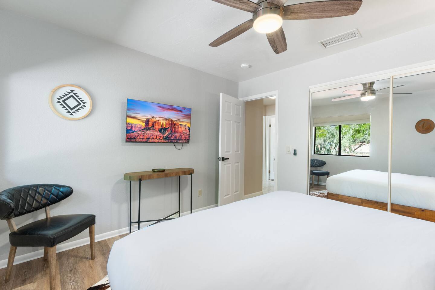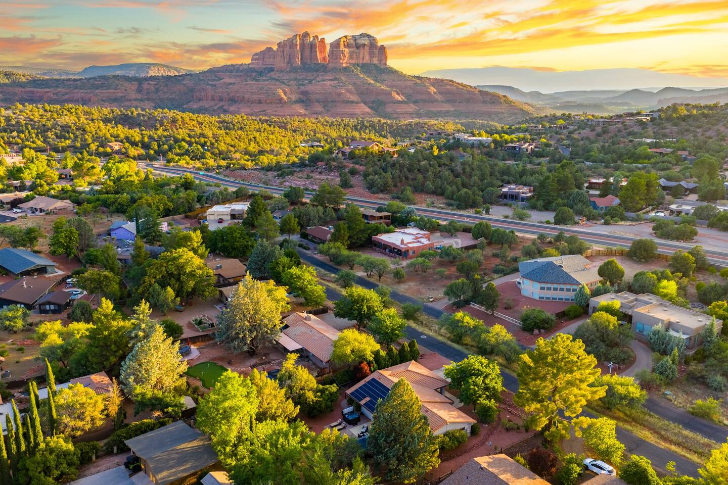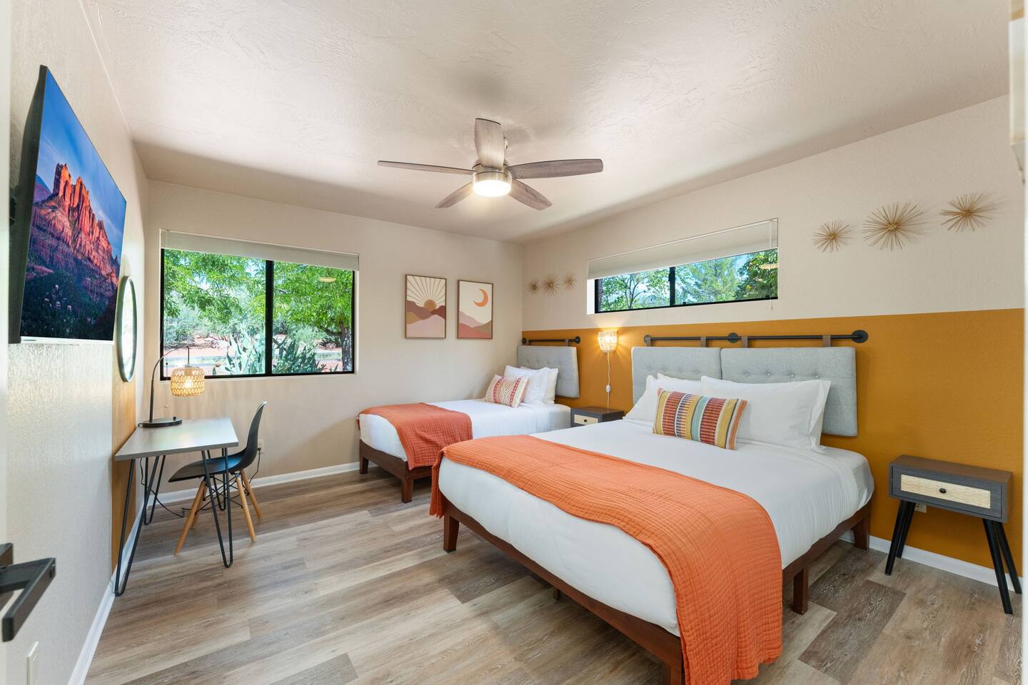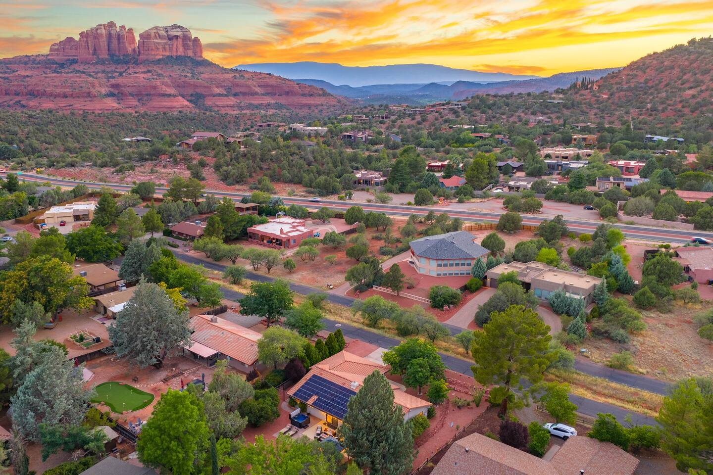 KEY FEATURES 🌄 Red Rock Views: Cathedral Rock and Mammoth Rock visible from the property 🚶 Walk to Trailheads: Easy neighborhood access to Chapel Trail, Mystic Trail, and Little Horse 📍 Prime Location: In Sedona’s coveted Chapel neighborhood, minutes to Uptown, West Sedona, and the Village of Oak Creek 🛁 Hot Tub and Two Fire Pits: Perfect for post-hike soaks and sunset nights 🏡 Spacious 4BR/2.5BA: Nearly 2,000 sq ft, comfortably sleeps up to 9 🛜 High-Speed Fiber Internet (300 Mbps): Great for streaming, video calls, or remote work 👶 Family-friendly: High chair and Pack ’n Play available 🧺 Washer and dryer: Easy resets for longer stays 🐾 Dog-friendly: Up to 2 well-behaved dogs welcome (fee applies) 🌞 Solar Powered: Energy-efficient and eco-minded WHAT GUESTS ARE SAYING “10/10 house. The best house I ever booked from Airbnb.” — Jenny “An exceptional retreat that truly feels like home.” — Freddie “The house and yard were roomy, and the neighborhood peaceful and very scenic.” — Caroline “The location is unbeatable... just minutes from the best trailheads and restaurants!” — Tim "I wish we didn't have to leave." — Brook “We would be thrilled to stay here again on my next trip to Sedona.” — Edith INSIDE Vista Bonita is comfortable, thoughtfully arranged, and designed for unwinding between red rock adventures. You’ll have great views, two living areas, and the kind of flow that works for families, couples, and friend groups alike. KITCHEN & LIVING AREAS The home features two separate living spaces, so your group can gather together or spread out. • Main living room: Large comfy sectional, smart TV, soundbar • Second living area: Ideal for reading, games, or a quiet movie night • Kitchen: Fully stocked cookware and utensils, bar seating, Keurig and drip coffee makers • Breakfast nook: A sunny spot for morning coffee • Dining table: Great for group dinners 4 BEDROOMS Each bedroom has its own vibe and is well equipped. • Primary Suite: King bed, ensuite bathroom, and direct patio access. Spacious and serene, perfect for relaxing after a day of adventure. • Desert Dusk Suite: Queen bed + twin bed. Cozy with sunset tones. Ideal for mix groups or kids. • Modern Ranch Suite: King bed. Modern Western style. • Canyon Bloom Suite: King bed. Floral touches and soft lighting for a dreamy stay. Each bedroom includes luggage racks, closet storage, smart TV, and extra pillows/blankets. 2.5 BATHROOMS Fresh towels, hair dryer, and essential toiletries are provided. • Primary en-suite: Dual sinks, shower, and large closet. • Guest bathroom: Sinks and shower/bath combo. • Half bath: Conveniently located near the kitchen/living area. OUTDOOR EXPERIENCE Set on over ⅓ of an acre, Vista Bonita’s yard is made for gathering, stargazing, and slowing down. • Hot tub for starlit soaks • Two fire pits: Propane fire pit with cushioned seating, plus a wood fire pit (subject to local fire restrictions) • Outdoor dining for al fresco dinners • Water feature for a calm, desert soundtrack • Loungers for sun, shade, and night skies LOCATION Nestled in the quiet Chapel neighborhood, you’re ideally positioned between Uptown, West Sedona, and the Village of Oak Creek. You're close to restaurants and shops and also walking distance to iconic trailheads. • Walkable access to Chapel Trail, Mystic Trail, and Little Horse • <6 min drive to Bell Rock, Cathedral Rock Trailhead • 8 min drive: Tlaquepaque Arts & Shopping Village DOGS WELCOME Up to 2 well-behaved dogs are welcome for an additional fee. Please clean up after them, keep them off furniture, and do not leave them unattended. We provide a fenced area plus food and water bowls. FINAL NOTES • Smart lock for easy self-check-in • Washer/dryer included • Driveway parking for 2 cars, with room for 1 more car on the gravel (3 cars total)