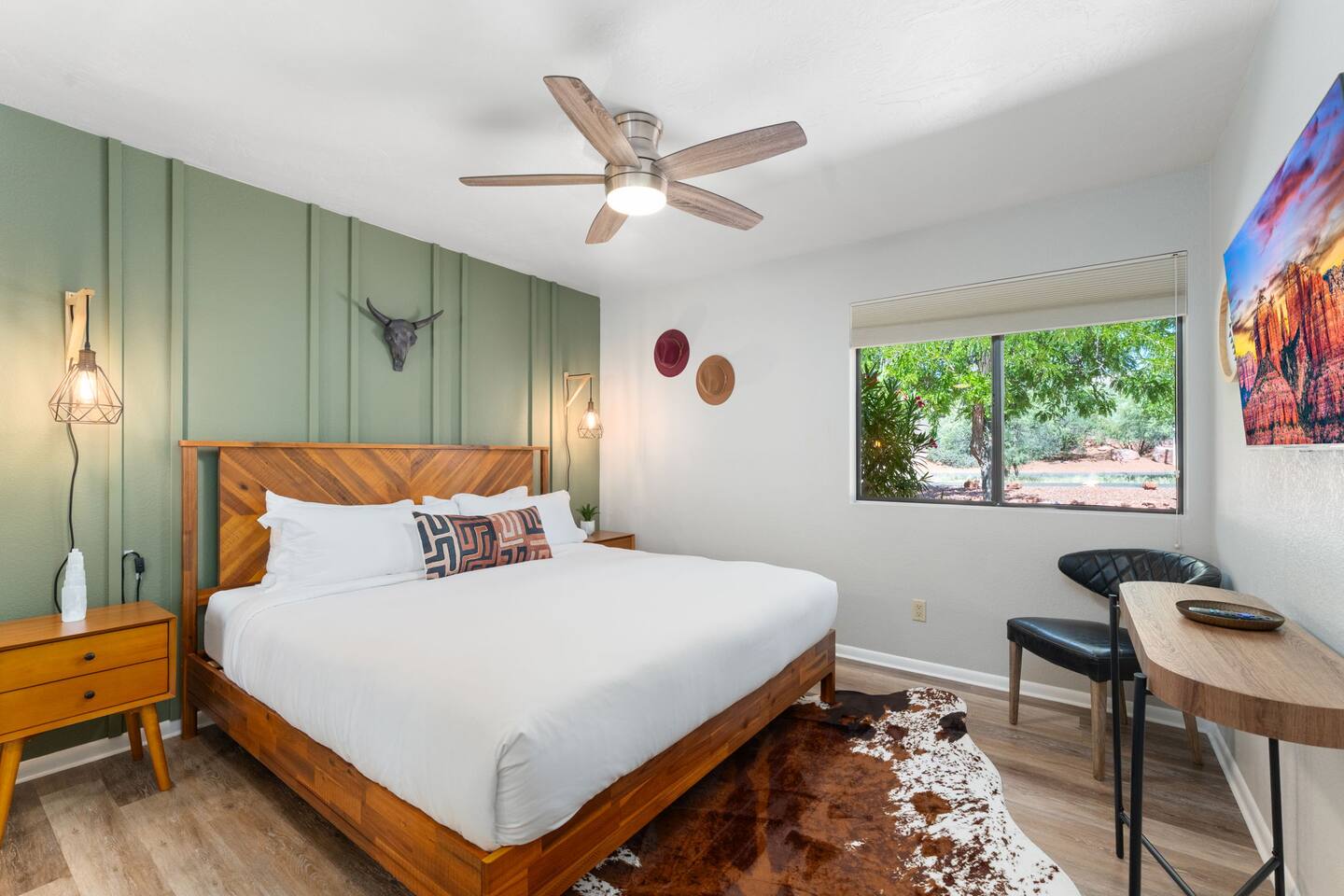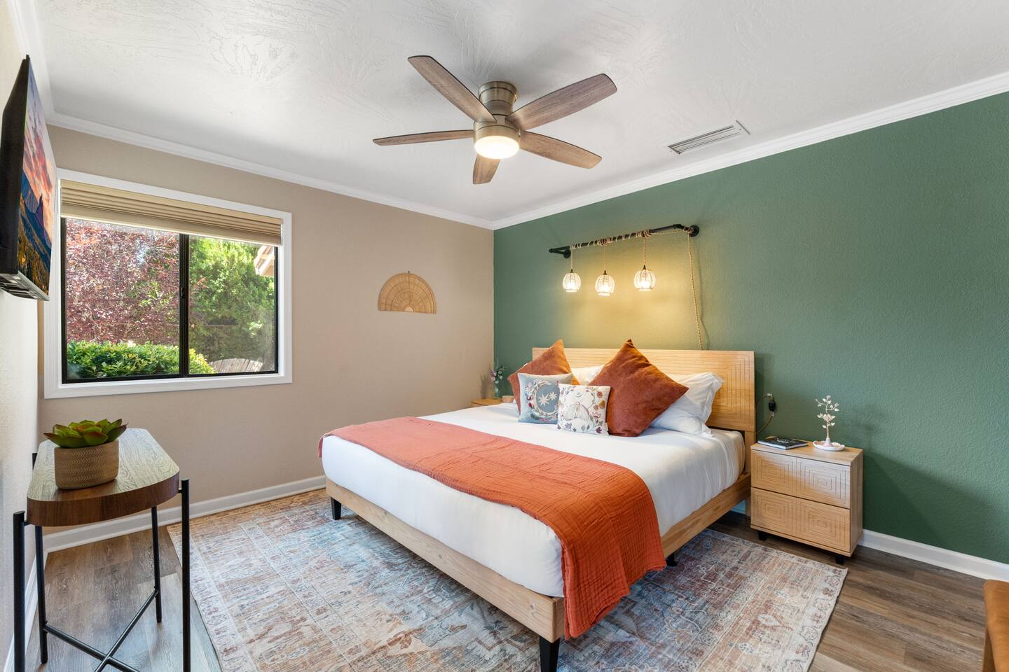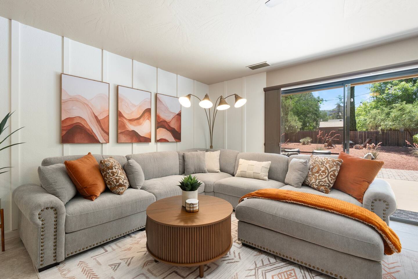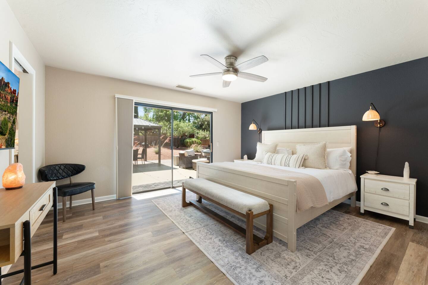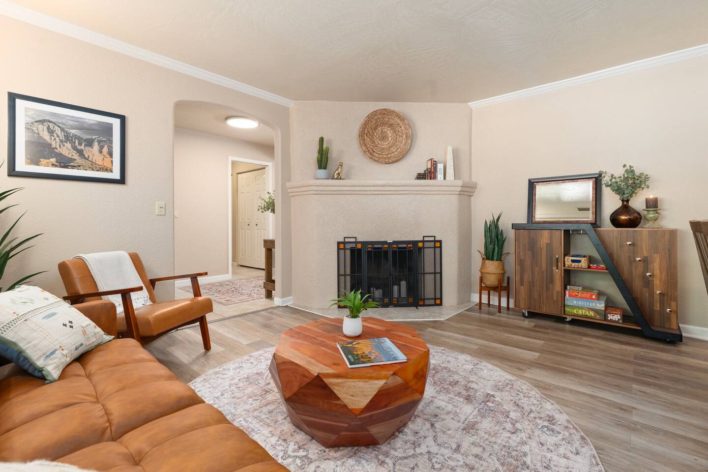 KEY FEATURES 🌄 Red Rock Views: Cathedral Rock and Mammoth Rock visible from the property 🚶 Walk to Trailheads: Easy neighborhood access to Chapel Trail, Mystic Trail, and Little Horse 📍 Prime Location: In Sedona’s coveted Chapel neighborhood, minutes to Uptown, West Sedona, and the Village of Oak Creek 🛁 Hot Tub and Two Fire Pits: Perfect for post-hike soaks and sunset nights 🏡 Spacious 4BR/2.5BA: Nearly 2,000 sq ft, comfortably sleeps up to 9 🛜 High-Speed Fiber Internet (300 Mbps): Great for streaming, video calls, or remote work 👶 Family-friendly: High chair and Pack ’n Play available 🧺 Washer and dryer: Easy resets for longer stays 🐾 Dog-friendly: Up to 2 well-behaved dogs welcome (fee applies) 🌞 Solar Powered: Energy-efficient and eco-minded WHAT GUESTS ARE SAYING “10/10 house. The best house I ever booked from Airbnb.” — Jenny “An exceptional retreat that truly feels like home.” — Freddie “The house and yard were roomy, and the neighborhood peaceful and very scenic.” — Caroline “The location is unbeatable... just minutes from the best trailheads and restaurants!” — Tim "I wish we didn't have to leave." — Brook “We would be thrilled to stay here again on my next trip to Sedona.” — Edith INSIDE Vista Bonita is comfortable, thoughtfully arranged, and designed for unwinding between red rock adventures. You’ll have great views, two living areas, and the kind of flow that works for families, couples, and friend groups alike. KITCHEN & LIVING AREAS The home features two separate living spaces, so your group can gather together or spread out. • Main living room: Large comfy sectional, smart TV, soundbar • Second living area: Ideal for reading, games, or a quiet movie night • Kitchen: Fully stocked cookware and utensils, bar seating, Keurig and drip coffee makers • Breakfast nook: A sunny spot for morning coffee • Dining table: Great for group dinners 4 BEDROOMS Each bedroom has its own vibe and is well equipped. • Primary Suite: King bed, ensuite bathroom, and direct patio access. Spacious and serene, perfect for relaxing after a day of adventure. • Desert Dusk Suite: Queen bed + twin bed. Cozy with sunset tones. Ideal for mix groups or kids. • Modern Ranch Suite: King bed. Modern Western style. • Canyon Bloom Suite: King bed. Floral touches and soft lighting for a dreamy stay. Each bedroom includes luggage racks, closet storage, smart TV, and extra pillows/blankets. 2.5 BATHROOMS Fresh towels, hair dryer, and essential toiletries are provided. • Primary en-suite: Dual sinks, shower, and large closet. • Guest bathroom: Sinks and shower/bath combo. • Half bath: Conveniently located near the kitchen/living area. OUTDOOR EXPERIENCE Set on over ⅓ of an acre, Vista Bonita’s yard is made for gathering, stargazing, and slowing down. • Hot tub for starlit soaks • Two fire pits: Propane fire pit with cushioned seating, plus a wood fire pit (subject to local fire restrictions) • Outdoor dining for al fresco dinners • Water feature for a calm, desert soundtrack • Loungers for sun, shade, and night skies LOCATION Nestled in the quiet Chapel neighborhood, you’re ideally positioned between Uptown, West Sedona, and the Village of Oak Creek. You're close to restaurants and shops and also walking distance to iconic trailheads. • Walkable access to Chapel Trail, Mystic Trail, and Little Horse • <6 min drive to Bell Rock, Cathedral Rock Trailhead • 8 min drive: Tlaquepaque Arts & Shopping Village DOGS WELCOME Up to 2 well-behaved dogs are welcome for an additional fee. Please clean up after them, keep them off furniture, and do not leave them unattended. We provide a fenced area plus food and water bowls. FINAL NOTES • Smart lock for easy self-check-in • Washer/dryer included • Driveway parking for 2 cars, with room for 1 more car on the gravel (3 cars total)